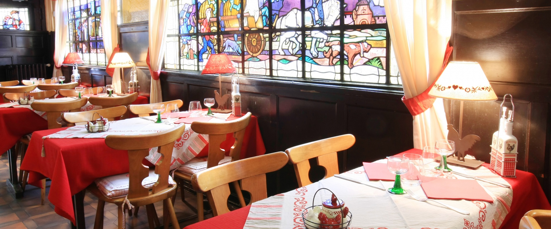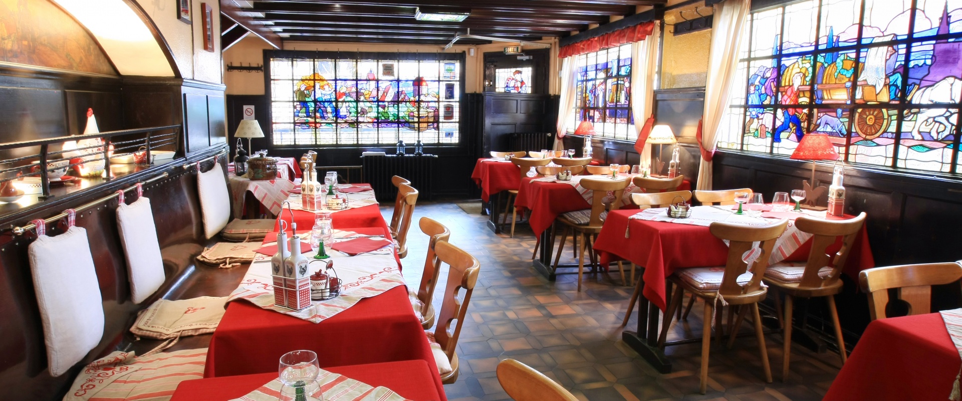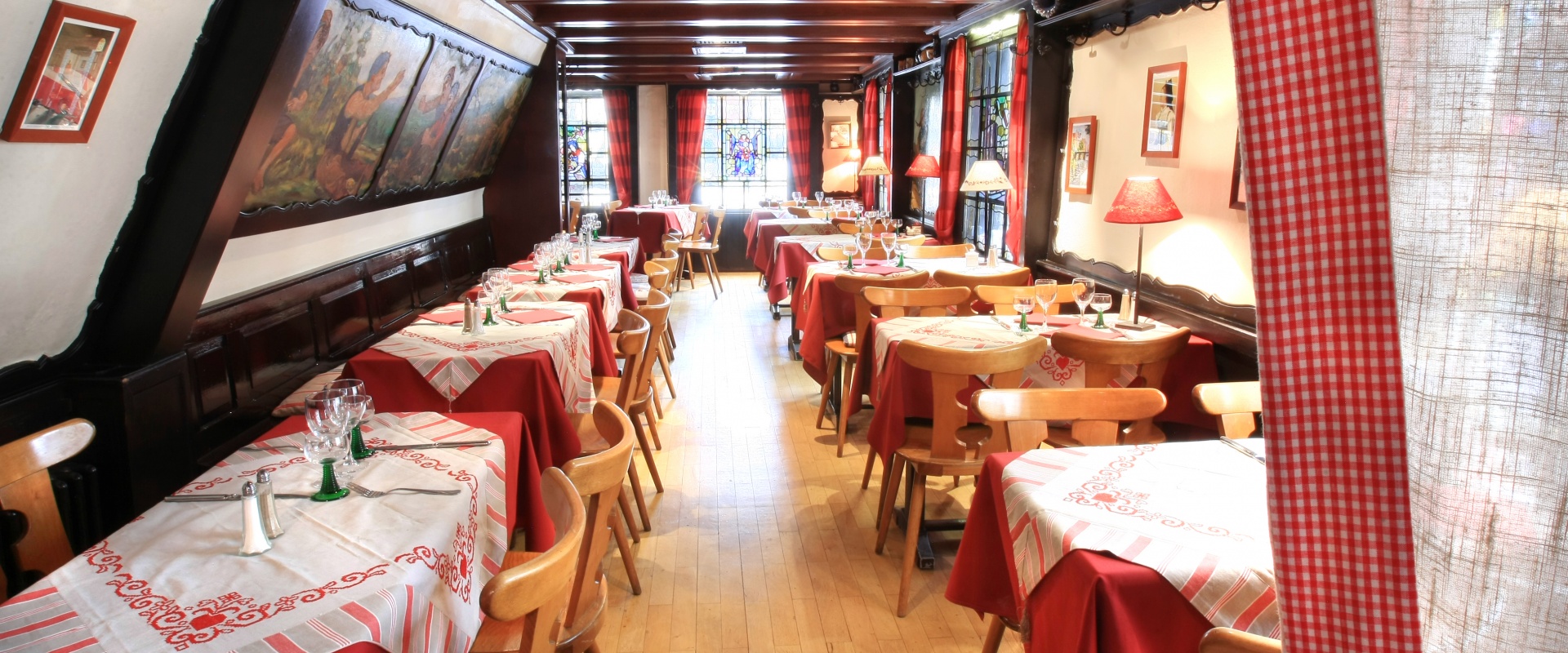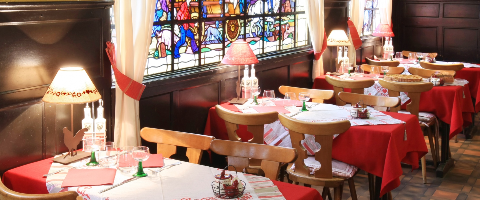 The atmosphere is warm and authentic with its wooden tables dressed in the typical Alsatian “kelsch” fabric, complemented by traditional decorative objects. The rustic character is assured with its low ceilings and exposed beams.