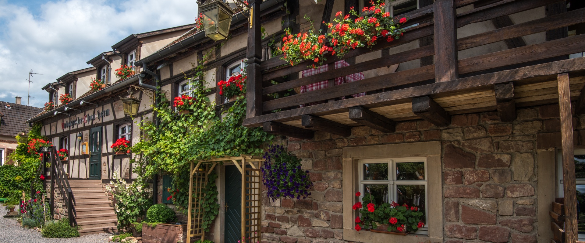 The Auberge du Chou’Heim used to be a tithe farm. It is said that one tenth of the crops stored there went to the lord who lived in the castle, which at that time was located in the center of Krautergersheim. The building was converted into a restaurant in the 1990s and has become one of the highlights of traditional Alsatian gastronomy.
