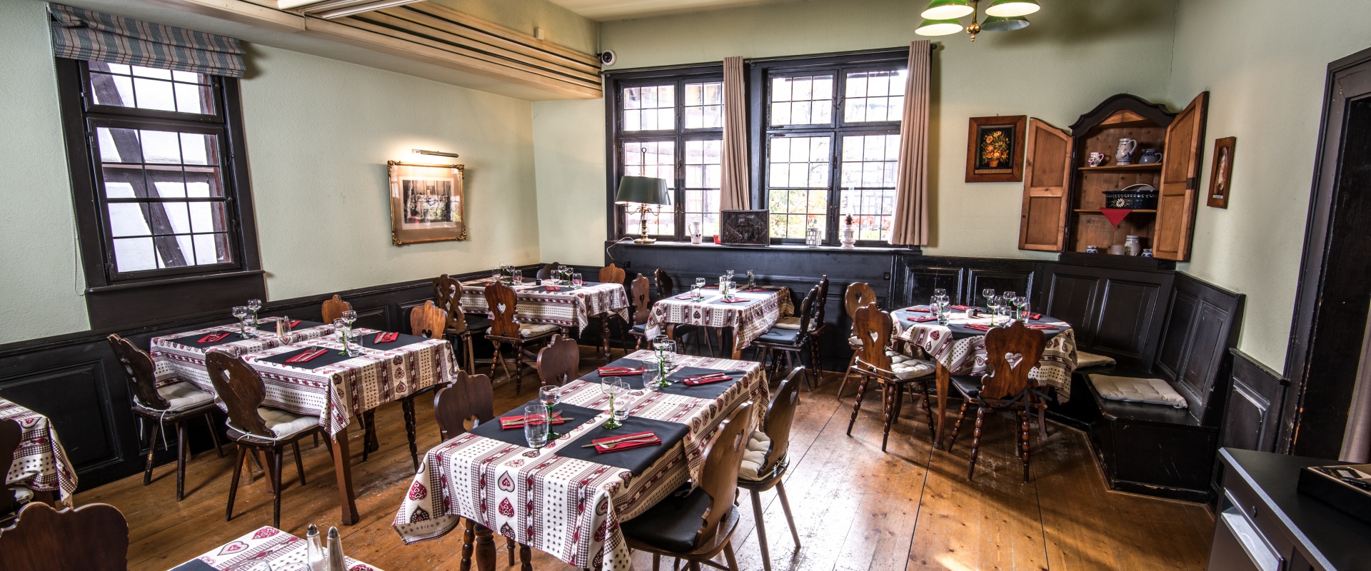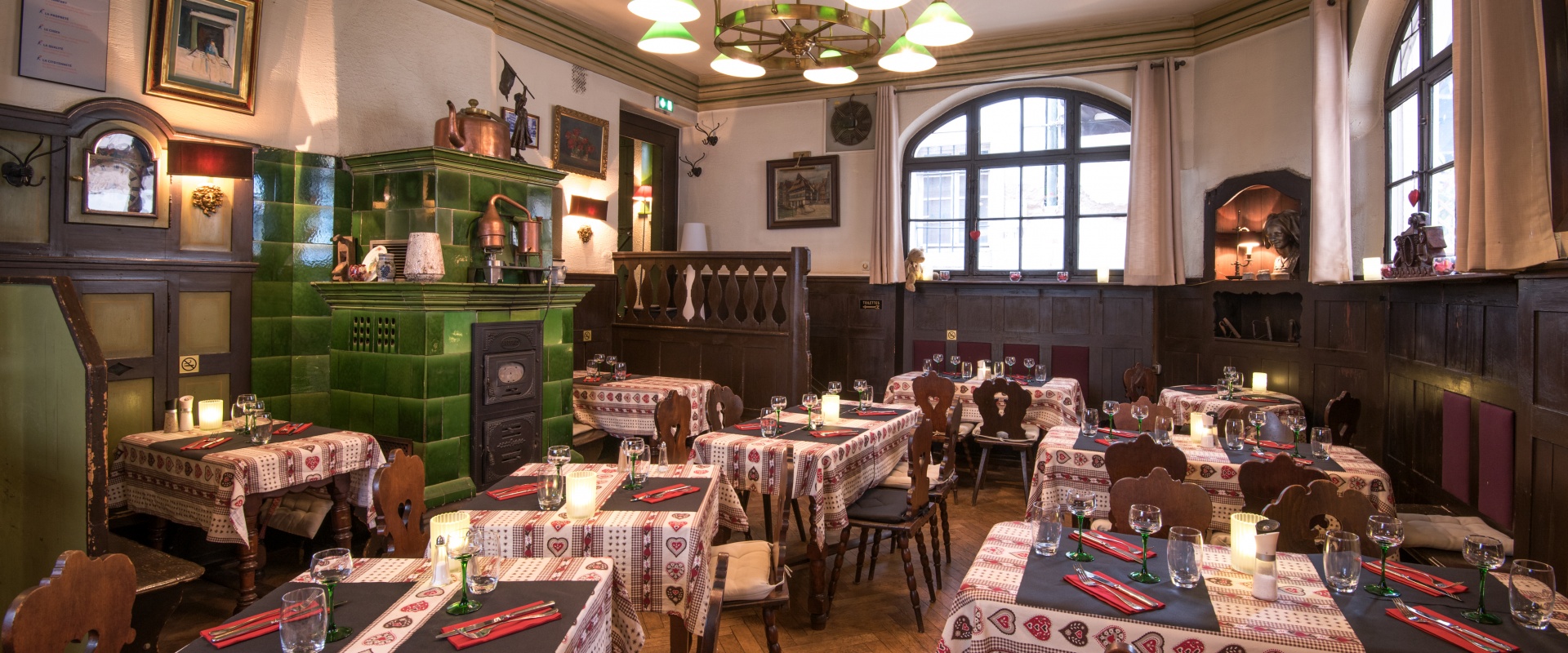 Sitôt la porte franchie, vous voilà dans une chaleureuse salle alsacienne qui renferme un ancien poêle en faience qui chauffe aujourd’hui encore les lieux.